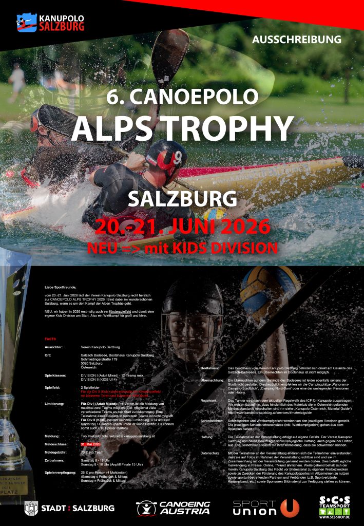 Der Verein Kanupolo Salzburg lädt herzlich zur 6. CANOEPOLO ALPS TROPHY vom 20.-21. Juni 2026 im wunderschönen Salzburg ein.